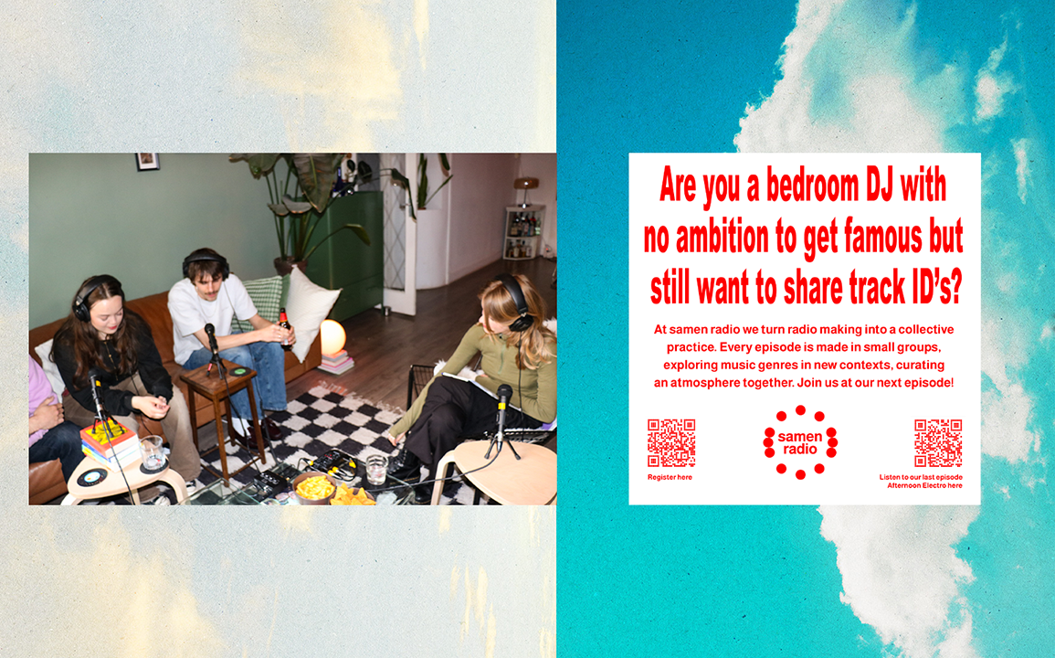 At Samen Radio we take agency of how we consume music, which is together and connected. No one is a guest in the show, we’re all equal curators. We gather in a room with 3-5 people, taking a moment to listen to the music we brought and record our conversations. While doing this we explore party music genres in a new context. We share our picked tracks and merge our personal interests creating a one hour long sound piece. It’s a collaborative method, with a structure made to function as a tool for connection.