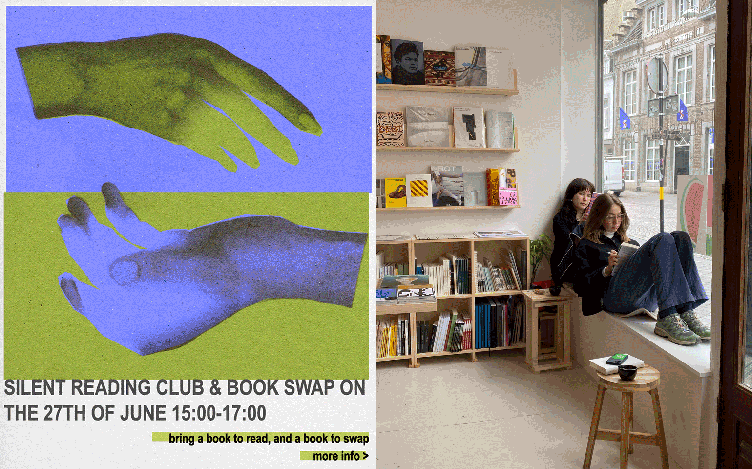 Interning at Limestone Books in Maastricht was a great experience for me, especially for learning about cultivating communities and designing events. I had multiple roles within the store which brought about a nice variety of activities. I did things like designing identities for events, bookbinding, archiving, working together with artists, brainstorming for event concepts, hosting the bookshop and overall a being dynamic and social person.